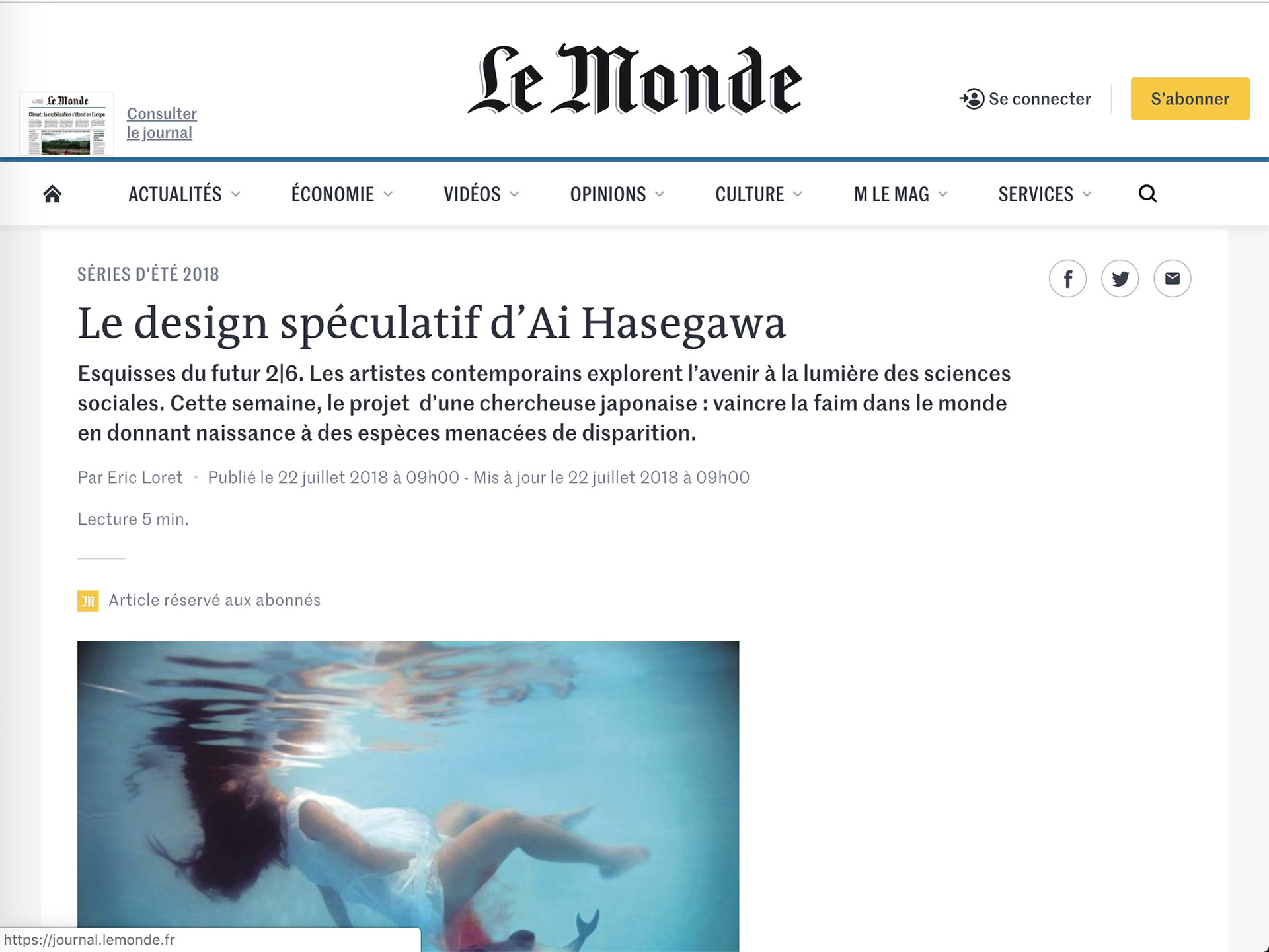2018 July 作品掲載 [ (Im)possible baby, I wanna deliver a dolphin...] Featured : Le Monde “Le design spéculatif d’Ai Hasegawa”,