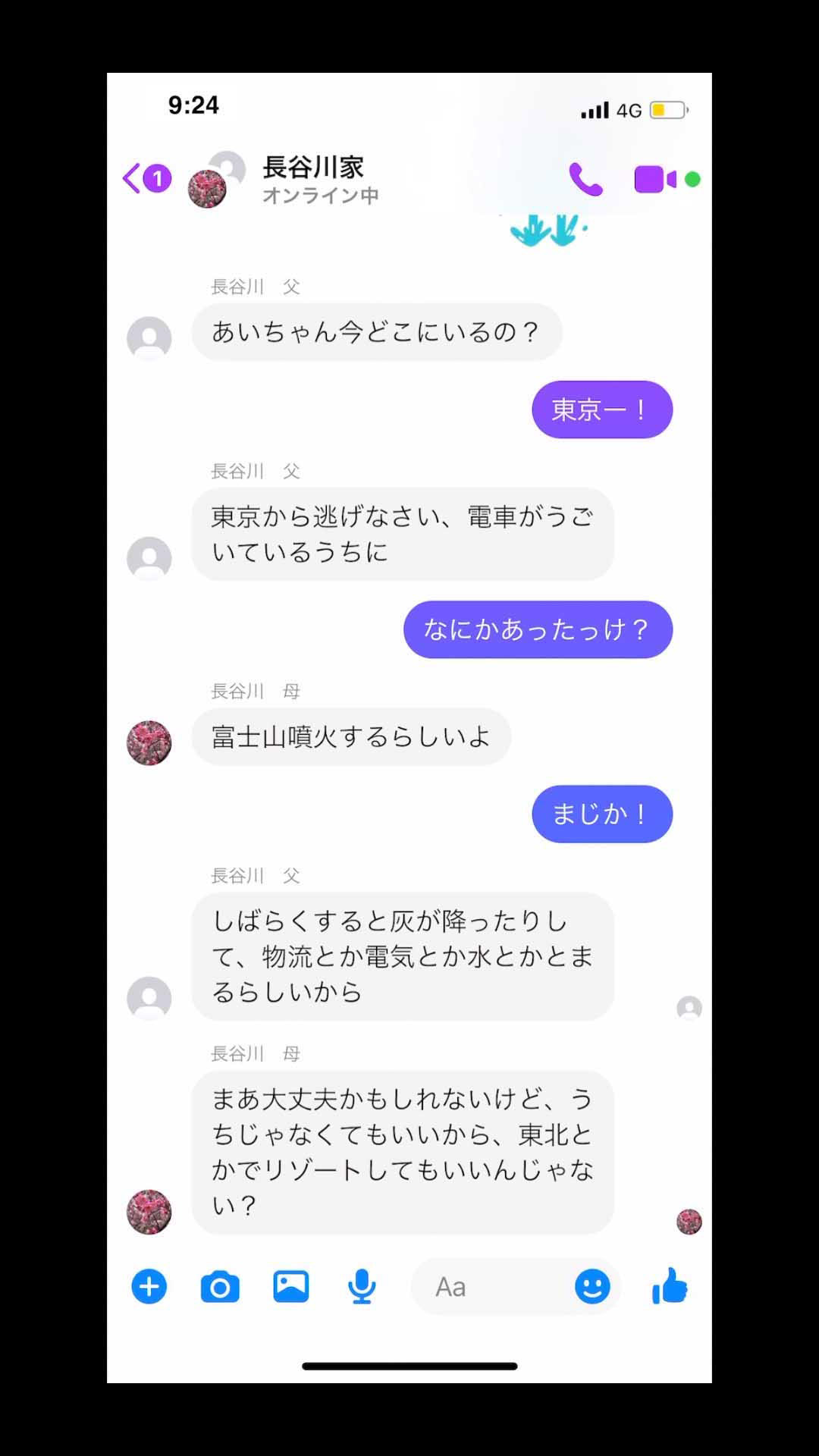 5時間前に富士山噴火の警告が届いたとき、私たちはどうするのでしょうか。長谷川家の両親との携帯での会話。