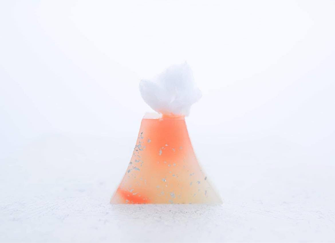 富士山ハザードマップによる噴火口想定ラインの一つ、宝永噴火口上部からの噴火を模した蓋。その新しい噴火口から湯気が立ち昇る。蓋は柔らかい素材で出来ており、噴火前には山が膨らむように、湯の沸騰で蓋の山全体も膨らみ上下する。